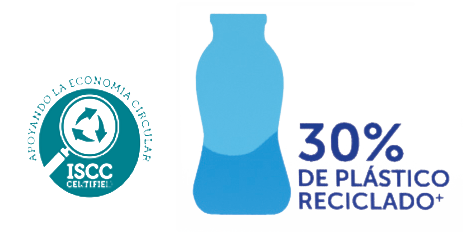 *El contenido en plástico reciclado certificado de esta botella (tapón y etiqueta no incluidos) está asignado utilizando el balance de masas ISCC PLUS (sistema que garantiza que se ha introducido en el proceso de fabricación del plástico una cantidad de plástico reciclado equivalente a la declarada en nuestras botellas).