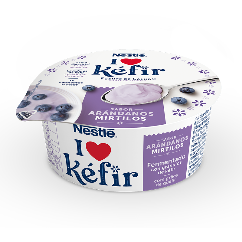 Leche fermentada, con levaduras y gránulos de kéfir, sabor a arándanos. Con edulcorantes.